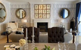 古い日本製のテーブルランプは細やかなビーズ加工とすりガラスのシェードには桜がデザインされ、ウィリアムモリスの壁紙chrysanthemum(クリサンセマム)は日本の象徴である「菊」をイメージさせます。